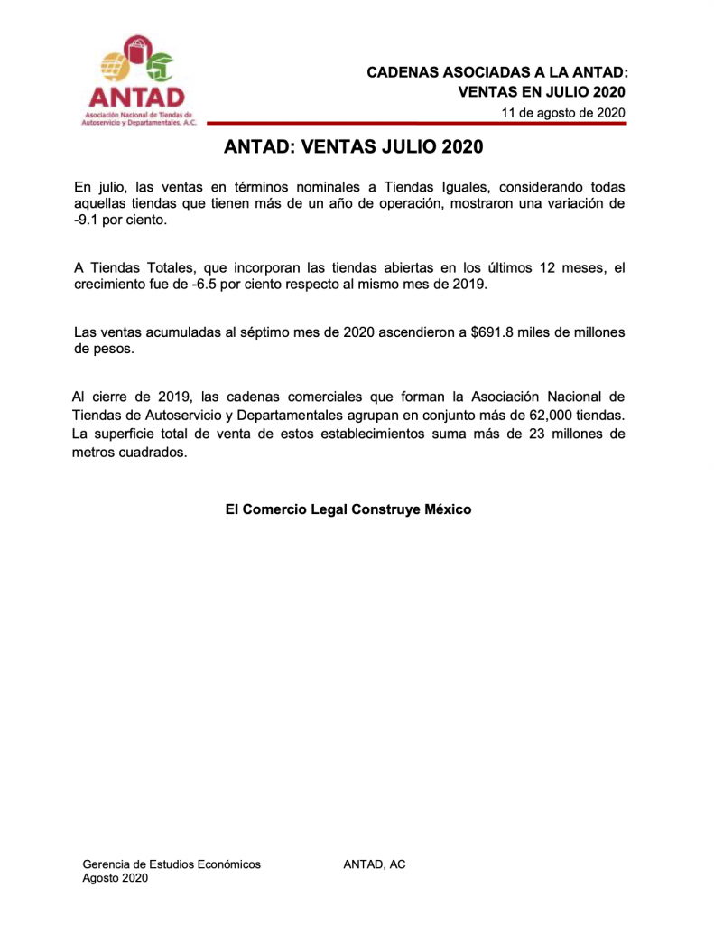 Durante esta semana la Asociación Nacional de Tiendas de Autoservicio y Departamentales (ANTAD) publicó las ventas registradas en Julio 2020 en tiendas comparables, las cuales llevan abiertas más de 1 año, dichas ventas cayeron (-)9.1% respecto a Julio del 2019.