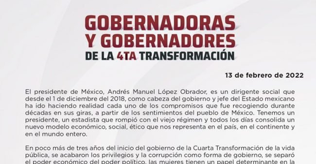 Hace unos cuantos días los gobernadores, gobernadoras y la jefa de Gobierno de la Ciudad de México, funcionarios de Morena, firmaron y lanzaron un comunicado de respaldo para el presidente Andrés Manuel López Obrador.