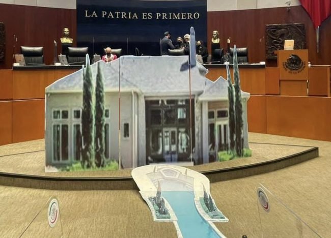 Los senadores del PAN, que se encuartelaron en la tribuna para exigir que se discutiera el asunto, se presentaron con una réplica de lo que llamaron, la Casa Gris. Una impresión en cartón tamaño industrial de la casa en Houston en la que vivió el hijo de AMLO.