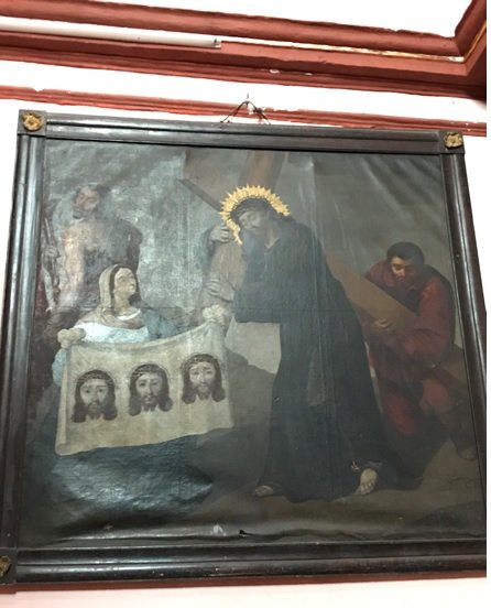 La primera imagen se tomó del templo de la Santa Cruz, donde se ilustra el encuentro de la Verónica en el Viacrucis, que legendariamente prestó un lienzo para que Cristo se limpiara el sudor, dejando impreso su rostro en el mismo, aquí ilustrando tres rostros idénticos en vez de uno (una imagen parecida, del lienzo se encuentra en el templo de la Soledad).