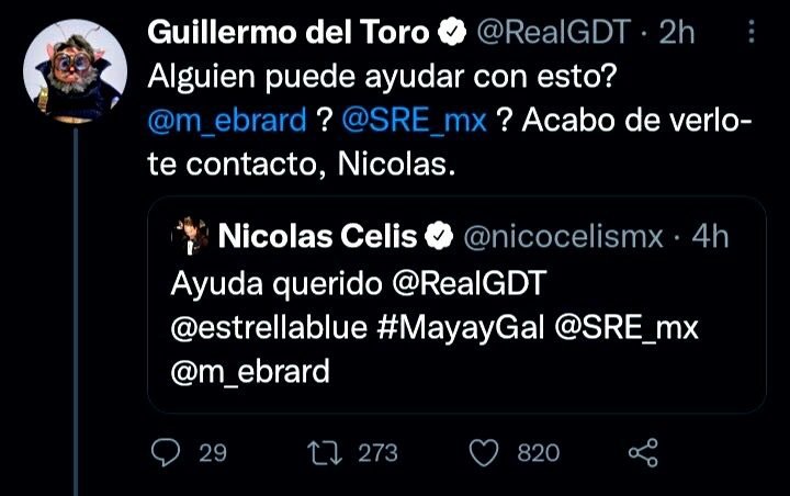 El productor Nicolás Celis, pidió ayuda a Guillermo del Toro para que diera difusión al caso, lo cual el ganador del Oscar hizo pidiendo apoyo a Marcelo Ebrad que no tardó en responder y ofrecer ayuda a ambos cineastas