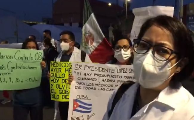 Este jueves 19 de mayo, se manifestaron frente al Palacio Nacional, un grupo de médicos del Instituto Mexicano del Seguro Social (IMSS), quienes están en contra de la contratación de profesionales cubanos y que ya habían sido anunciados por el presidente Andrés Manuel López Obrador.