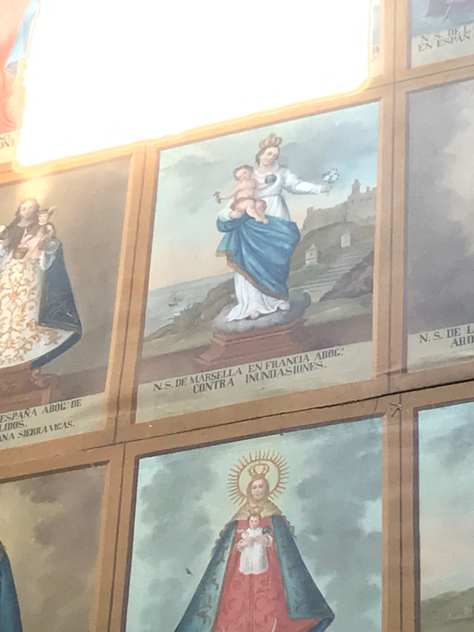 Dicho espacio fue decorado con imágenes pintadas de las diversas advocaciones Marianas, alrededor de 300 de ellas, que presentan debajo de la imagen su nombre y en ocasiones el patronazgo de las mismas.