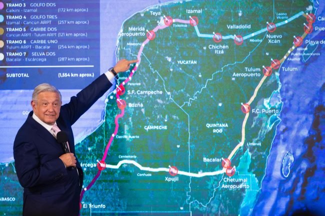 López Obrador, afirmó que usaran el derecho de vía, pero si existen bloqueos por parte de los inconformes, no existirá tren maya en sus últimos tramos: “Si no se acepta, pues nos vamos por el derecho de vía, ahí hay 40 metros y ya de Chetumal a Escárcega es una sola vía, es Chetumal a Cancún, y de Cancún a Mérida, son dos vías, se requiere más terreno… Pero acá es una sola vía y sí podemos acomodar el Tren en los 40 metros, la carretera, el Tren, y si aún así hay bloqueos y no nos dejan, se queda el Tren hasta Xpujil y no hay tren de Xpujil a Chetumal. Nada más que se va a saber quiénes fueron los responsables de detener esta obra”.