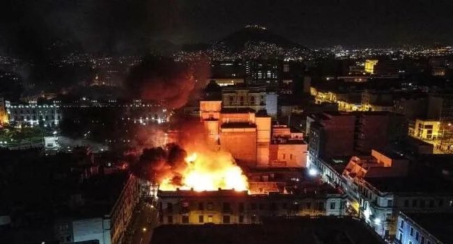 Manifestantes en Perú incendiaron un edificio antiguo cercano a la Plaza de San Martín, que fue declarada Patrimonio de la Humanidad por la Unesco en 1988, durante la movilización masiva llamada la Toma de Lima, con la que piden la renuncia de la presidenta Dina Boluarte.