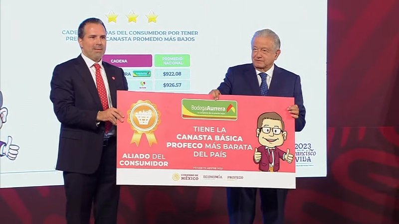 El procurador Federal del Consumidor, Ricardo Sheffield Padilla y el presidente Andrés Manuel López Obrador reconocieron a Bodega Aurrera, tienda que pertenece a la cadena Walmart de México, por su compromiso de mantener el precio más bajo en los 24 productos de la canasta básica durante el primer trimestre de este año.