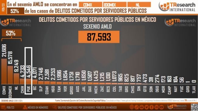 Durante el periodo del 1 de diciembre de 2018 a febrero del año en curso el Estado de Puebla se posicionó en el lugar número 5 a nivel nacional de delitos cometidos por funcionarios públicos.