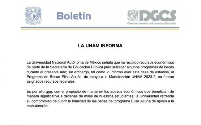 En el mensaje en el que la máxima casa de estudios dio esta noticia se adjuntó el oficio con el que la SEP mandó a decir que no dispondrá de recursos federales para las becas de manutención de este año. En dicho oficio se indica que, hasta 2021, la UNAM cubría esas becas con los 200 millones de pesos que recibía de parte de la Coordinación de Becas del Bienestar Benito Juárez, pero ya no lo hará.