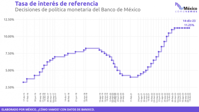 La Junta de Gobierno del Banco de México (Banxico) dejó sin cambios su tasa de interés de referencia durante la última reunión de política monetaria de 2023, y tal como esperaban los analistas, siguiendo los pasos de la Reserva Federal de Estados Unidos, el banco central mantuvo el indicador en 11.25 por ciento.