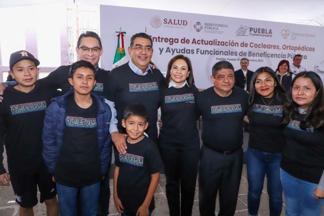 El gobernador Sergio Salomón Céspedes Peregrina y la presidenta honoraria del Sistema Estatal para el Desarrollo Integral de la Familia (Sedif), Gabriela Bonilla, entregaron a 587 poblanos implantes cocleares, ortopédicos y rehabilitatorios.