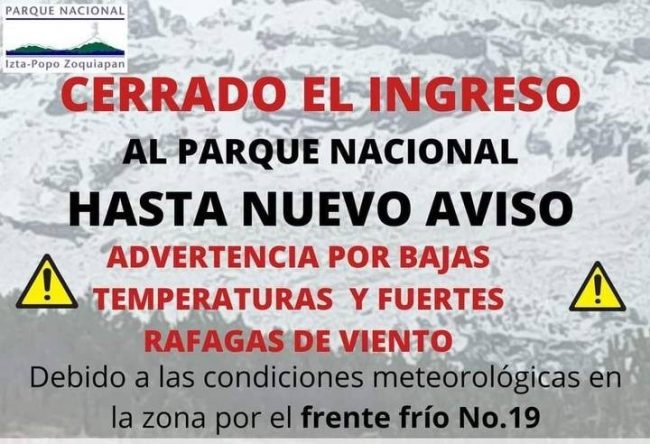 Por lo que las autoridades de protección civil y de la Secretaría del Medio Ambiente y Recursos Naturales (SMARN) y de la Comisión de Áreas Naturales Protegidas (CONANP), señalaron que las zonas de volcanes también serian cerradas hasta que cambien las condiciones del clima.