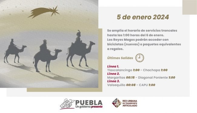 La última salida de la línea 2 será a las 00:15 horas de la estación Margaritas y a las 01:00 horas en la estación Diagonal Poniente. En el caso de la línea 3, de la terminal Valsequillo será a las 00:08 horas y de la parada al interior de la Central de Autobuses de Puebla (CAPU), será a las 01:00 horas del 6 de enero.
