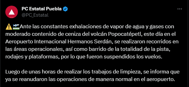 En tanto, Protección Civil del gobierno de Puebla también informó en sus redes sociales sobre la caída de ceniza por las emisiones del volcán, la cual caerá en la zona de la Angelópolis y hasta la Sierra Norte.