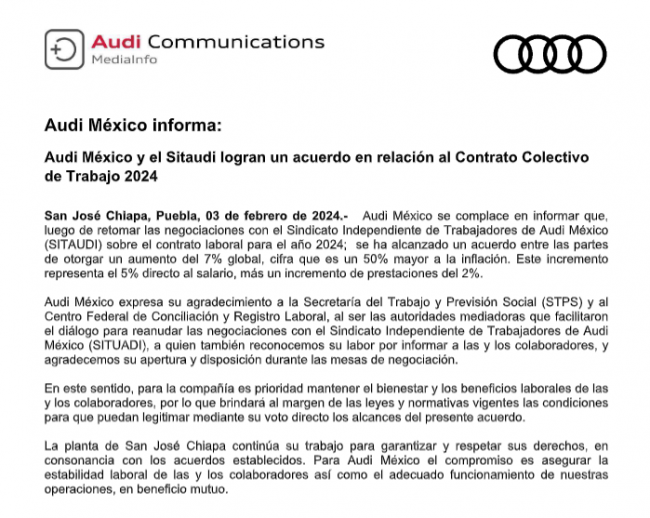 El Sindicato Independiente de Trabajadores de Audi de México (Sitaudi) fue convocado por la automotriz alemana para llevar a cabo la votación el próximo 9 de febrero en el CCU de la BUAP a fin declarar o no el fin de la huelga por el conflicto del aumento salarial.