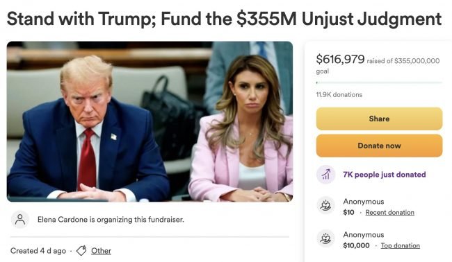 Una campaña abierta en GoFundMe para pagar la multa por fraude en Nueva York del expresidente Donald Trump está dentro de sus parámetros, señaló la plataforma mientras la recaudación sigue creciendo, acercándose a los 660 mil dólares.