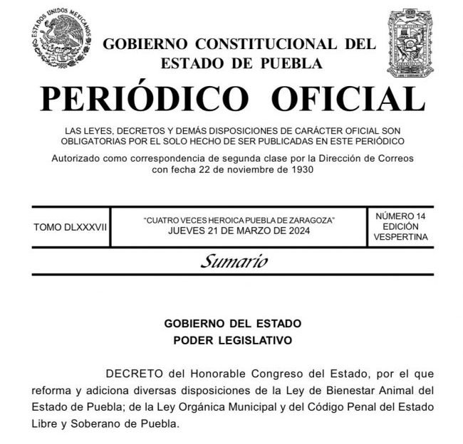 “En este momento ha sido publicado en el #PeriódicoOficial el Decreto por el que se reforman y adicionan diversas disposiciones de la Ley de #BienestarAnimal del Estado de #Puebla; de la Ley Orgánica Municipal y del Código Penal del Estado Libre y Soberano de Puebla”, acotó en su cuenta oficial X.