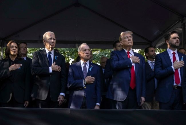 Harris y Trump se estrecharon la mano y hablaron justo antes de formar fila para la conmemoración. También asistió el ex alcalde de Nueva York Michael Bloomberg, de pie entre Biden y Trump.