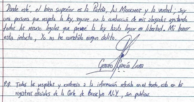 García Luna refrendó ser “una persona que respeta la ley” y adelantó que agotará todos los recursos legales a su alcance hasta lograr su libertad.