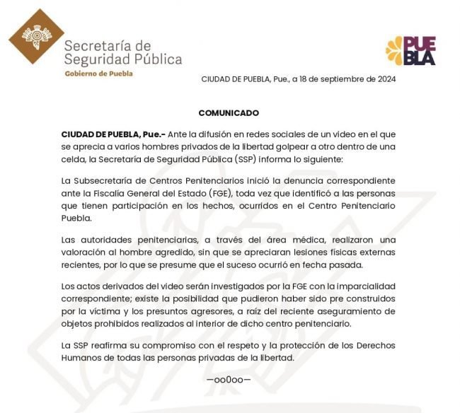 La noche de este miércoles 18 de septiembre circuló un metraje de 54 segundos en el que se puede ver a dos sujetos privados de la libertad que golpean a otro, al interior de una celda del Centro Penitenciario de Puebla.