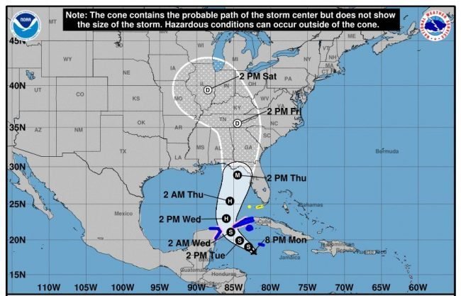 Autoridades mantienen zona de prevención por efectos de huracán desde Cabo Catoche hasta Tulum, incluido Cozumel, y zona de prevención por efectos de tormenta tropical desde Río Lagartos, en Yucatán, hasta Cabo Catoche, también en Quintana Roo.