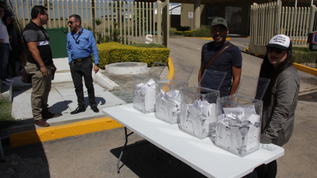 La votación se realiza afuera de las instalaciones del Poder Judicial, incluso, se observa como la puerta principal se mantiene cerrada y todavía existen varias lonas y un gran moño negro, donde muestra su rechazo a la Reforma al Poder Judicial.