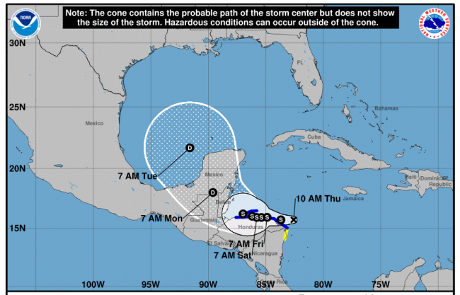La tormenta se desplazaría este viernes sobre Honduras, después ingresaría a Belice el domingo y, al final, atravesaría Campeche como depresión tropical, según la trayectoria prevista por el SMN.