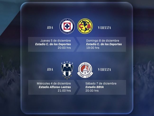 Cruz Azul, Rayados de Monterrey, Atlético de San Luis y América jugarán sus respectivas series entre miércoles 4 y el domingo 8 de diciembre, con los siguientes horarios: