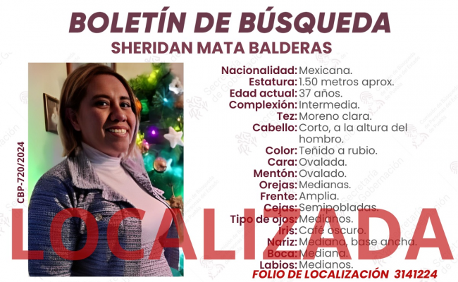 En un comunicado emitido por la Secretaría de Gobernación, se dio a conocer que la localización de Sheridan Mata fue fruto de actividades coordinadas entre diferentes instancias de gobierno, estableció las 13.45 horas como su hora de ubicación en una delegación de la ciudad de México, aunque sin ofrecer mayores detalles sobre el estado de la activista.