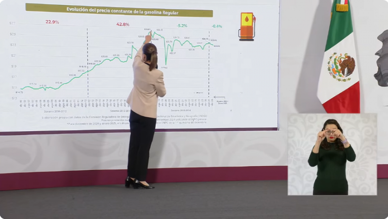 “Si no me equivoco este es el sexenio de Calderón, en términos reales subió el sexenio de Peña pues se acuerdan de los gasolina subió y si consideramos los 24 pesos que estarían aquí más o menos a la mitad, pues en términos de lo que equivaldría el valor en 2018 a la fecha estaría disminuyendo (…) esperamos que en unas dos semanas más o menos, y estemos firmando con todos los gasolineros que sería muy bueno porque es un acuerdo voluntario para que no suba de 24 y en el caso del banco es lo mismo que lo de los programas sociales del PRIAN, lo mismo durante toda la campaña se la pasaron diciendo que estaban a favor de los programas social”.