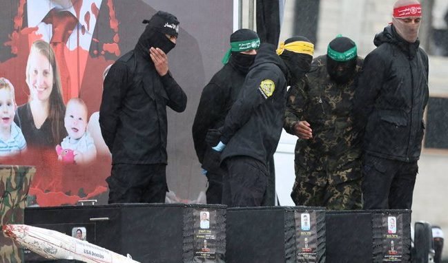 Milicianos del grupo islamista Hamás, acompañados de combatientes de la Yihad Islámica y de las Brigadas Muyahidines, entregaron en Jan Yunis, sur de Gaza, a la Cruz Roja los cadáveres de cuatro rehenes israelíes, tras exponer sus ataúdes.