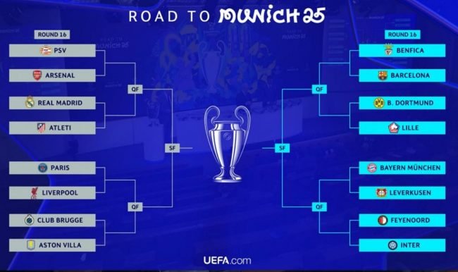 Los octavos de final de la UEFA Champions League tendrán un derbi madrileño, una eliminatoria entre el PSG y el Liverpool y la repetición del duelo entre el Barcelona y el Benfica por el otro lado del cuadro, que solo permitirá un nuevo cruce entre equipos españoles en la final el 31 de mayo en Múnich.