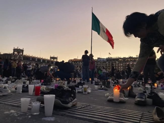 De forma simbólica fueron colocados pares de zapatos y veladoras, mientras que en el plancha de del Zócalo fueron pintados círculos con la palabra ‘Fosas’, y en las vallas que rodean a Palacio Nacional fueron colocadas mantas con rostros y datos de desaparecidos.