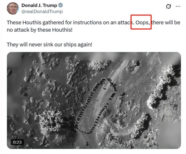 El presidente Donald Trump publicó un video que muestra decenas de muertos presuntamente rebeldes hutíes de Yemen, tras un ataque de Estados Unidos, acompañado del comentario “¡Ups!”.