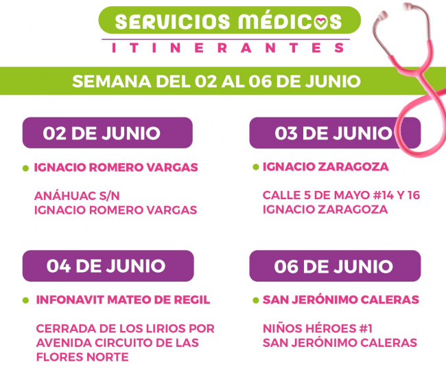 Para la semana del lunes 2 al viernes 6 de junio, los Servicios Médicos Itinerantes se encontrarán en los siguientes puntos en un horario de atención de 8:00 a 14:00 horas: