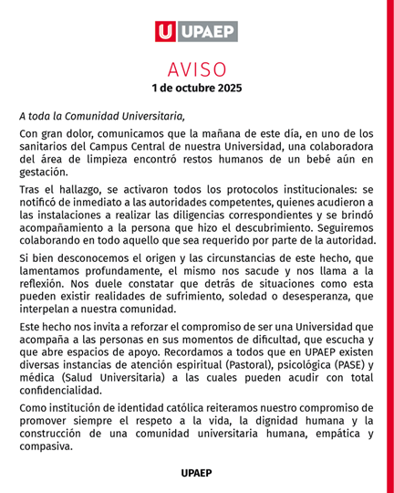 La mañana de este 1 de octubre 2025, se localizó un feto al interior de los baños de laUniversidad Popular Autónoma del Estado de Puebla (UPAEP) en la ciudad de Puebla. La institución católica confirmó que una colaboradora del área de limpieza localizó los restos humanos de un bebé que aún se encontraba en gestación.