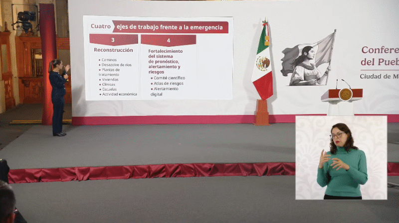 La mandataria adelantó que se trabaja en cuatro ejes para mejorar la atención a las emergencias, los cuales se consideraron y se aplicarán tras las lluvias en Veracruz, Hidalgo, Puebla, Querétaro y San Luis Potosí. Las describió de la siguiente forma: