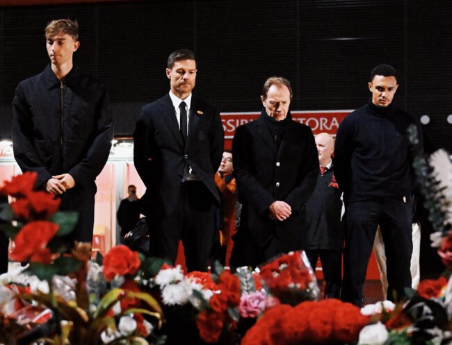 El DT de la Casa Blanca, Xabi Alonso, junto con el director de Relaciones Institucionales del club blanco, Emilio Butragueño, y los jugadores Dean Huijsen y Trent Alexander-Arnold se acercaron al memorial que los hinchas de los Reds armaron en recuerdo de su número 20, que perdió su vida en un accidente automovilístico al 3 de julio en Zamora, España.