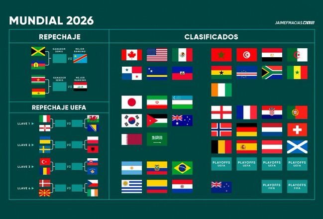 Los enfrentamientos del repechaje europeo y el torneo clasificatorio intercontinental para definir los últimos seis boletos que otorgan un lugar en el Mundial de México, Estados Unidos y Canadá 2026 han quedado definidos tras un sorteo realizado en la sede de la FIFA, en Zúrich.