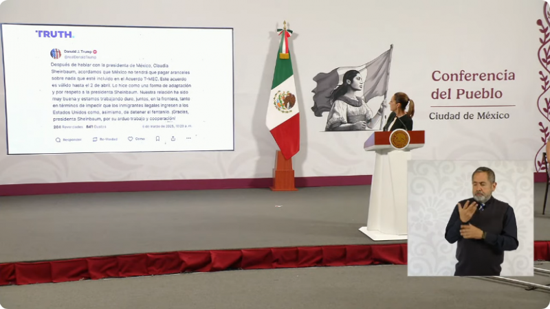 Por: Redacción Criterio Diario / Foto: Criterio Diario (especial). La Presidenta Claudia Sheinbaum inicia su conferencia matutina desde Salón Guillermo Prieto en Palacio Nacional. Prácticamente todo el comercio con EU está dentro del T-MEC: Sheinbaum sobre aranceles. Luego de que el presidente Donald Trump anunció que los aranceles no se aplicarán a los productos y […]