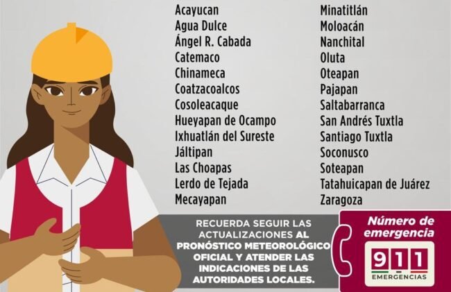 En el caso de Veracruz, se alertó una “emergencia meteorológica” por la cual se anunció la suspensión de clases, en todos los niveles educativos, en: Acayucan, Agua Dulce, Ángel R. Cabada, Catemaco, Chinameca, Coatzacoalcos, Cosoleacaque, Hueyapan de Ocampo, Ixhuatlán del Sureste, Jáltipan, Las Choapas, Lerdo de Tejada, Mecayapan, Minatitlán, Moloacán, Nanchital, Oluta, Oteapan, Pajapan, Saltabarranca, San Andrés Tuxtla, Santiago Tuxtla, Soconusco, Soteapan, Tatahuicapan de Juárez y Zaragoza.