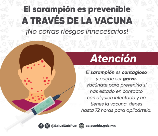 La Secretaría de Salud (Ssa) de Puebla confirmó el primer caso de sarampión en la entidad, en una mujer de 30 años derechohabiente del IMSS Ordinario y residente de la capital del estado. La dependencia estatal informó que el caso está plenamente identificado, bajo seguimiento médico y aislamiento domiciliario, y activó de inmediato el Equipo de Respuesta Rápida para cortar cadenas de contagio y reforzar la vigilancia epidemiológica.