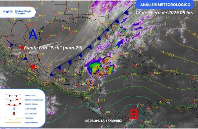 Este domingo, el frente frío número 29 se desplazó sobre el oriente del Golfo de México, península de Yucatán y sureste del país, originando lluvias puntuales intensas en Veracruz, Tabasco, Oaxaca y Chiapas; puntuales muy fuertes en Puebla; puntuales fuertes en Hidalgo, Campeche y Quintana Roo; así como chubascos en Yucatán.